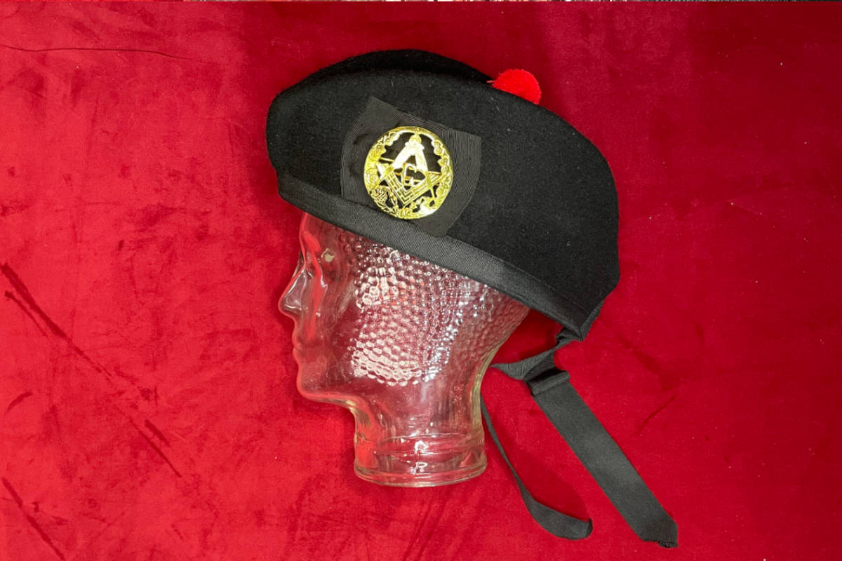 Couvre-chef de Maître Maçon du REAA (Rite Ecossais Ancien et Accepté), « Glengarry », de couleur noire, uni couleur, avec pompon rouge et deux cordons de phylactère arrière.