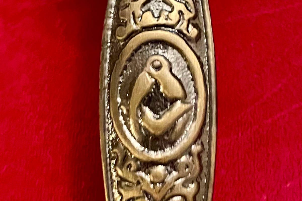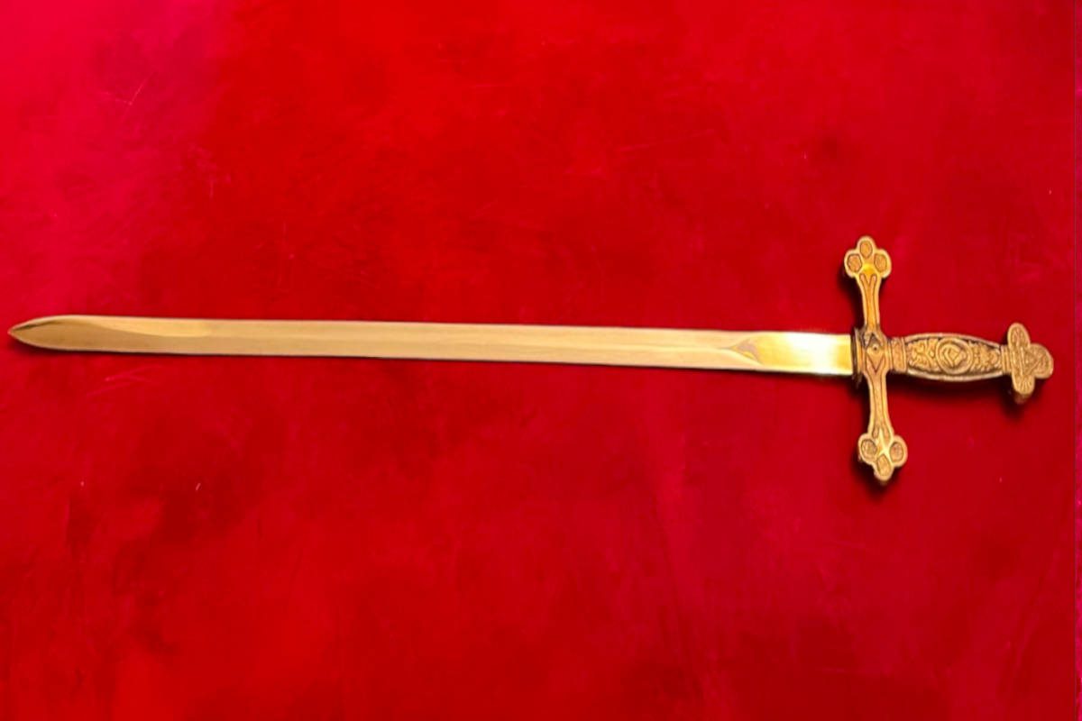EPEE Maçonnique avec Equerre – Compas et Delta flamboyant, Manche couleur cuivrée en alliage non-précieux. Longueur de l’épée 80 cm: _longueur lame 66 cm, largeur lame 2 cm