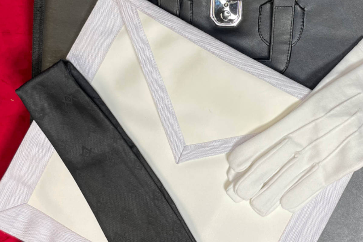 Lot de 6 décors maçonniques pour Apprentis-Compagnons, comprenant un Tablier, une paire de Gants blancs en coton, une Cravate noire, une Chemise blanche, des Boutons de manchettes et un Porte-décors