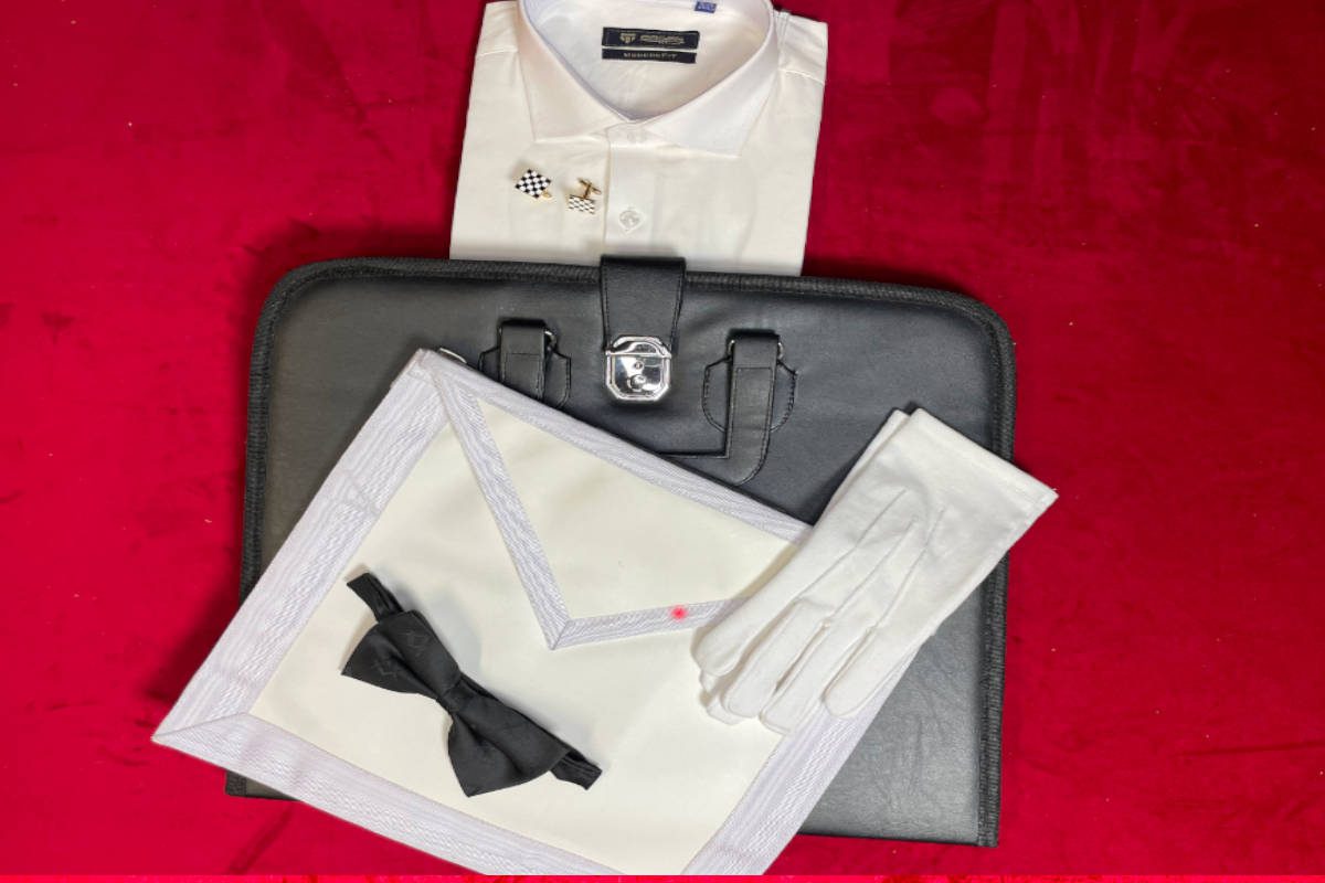 Lot Maçonnique – Kit complet « bien-démarrer » d’Apprentis-Compagnons: Tablier + Gants + Noeud-papillon + Chemise blanche + Boutons de manchettes (option) + Porte-décors