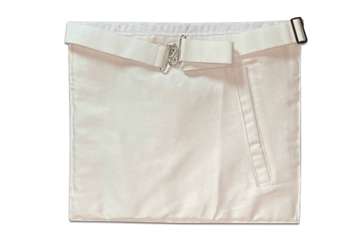 Lot Maçonnique de Tablier d’Apprenti – Compagnon, de couleur blanche, avec broderies de finitions, fermoir en forme de serpent argenté et poche dans le dos pour les gants – Gants blancs unis