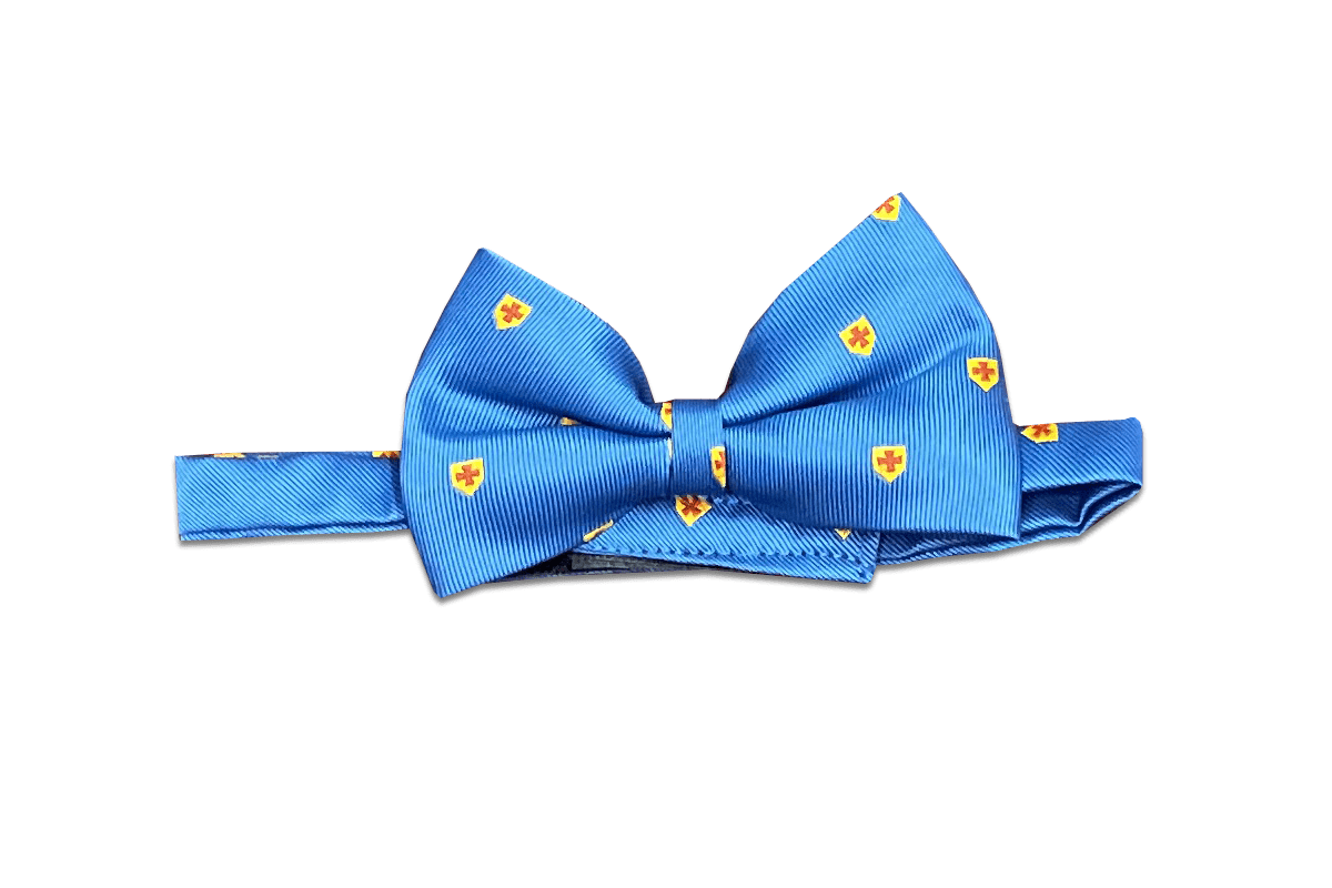 Nœud papillon maçonnique de couleur bleu royal, avec une Croix rouge dans un Ecusson jaune.