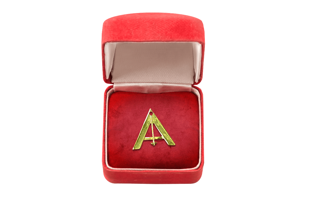Pendentif – Bijou pour le sautoir d’Officier 1° Surveillant, avec comme symbole maçonnique le niveau, en métal doré.