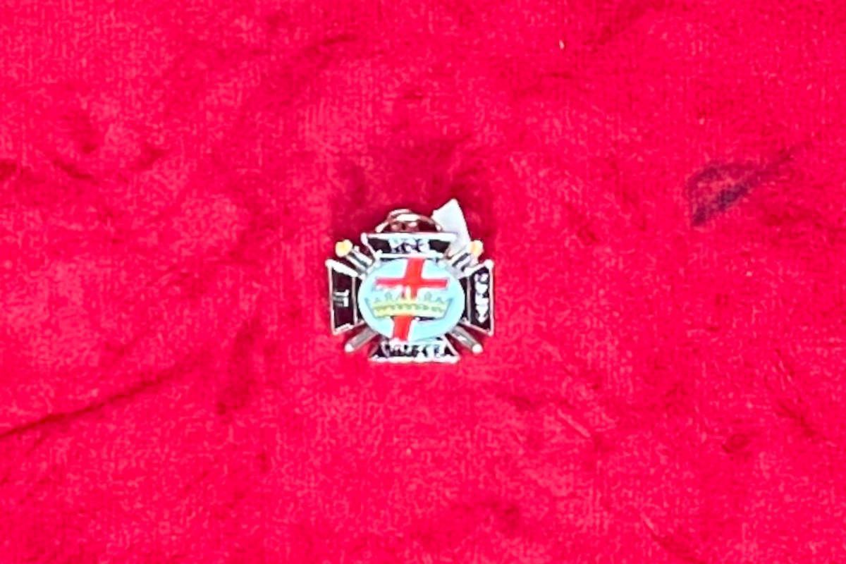 Pins Templier – IN HOC SIGNO VINCES – en alliage argenté non précieux avec Croix rouge et couronne dorée