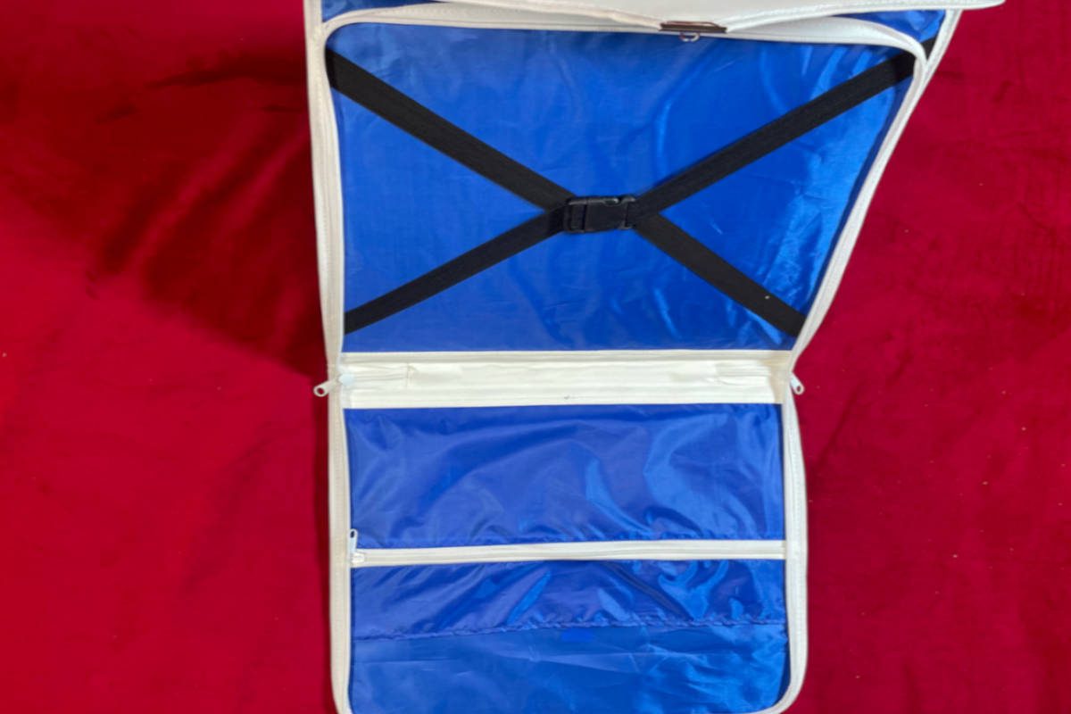 Cartable – porte-décors maçonniques en matière souple, de couleur blanche avec une fermeture par boucle dorée et zip.