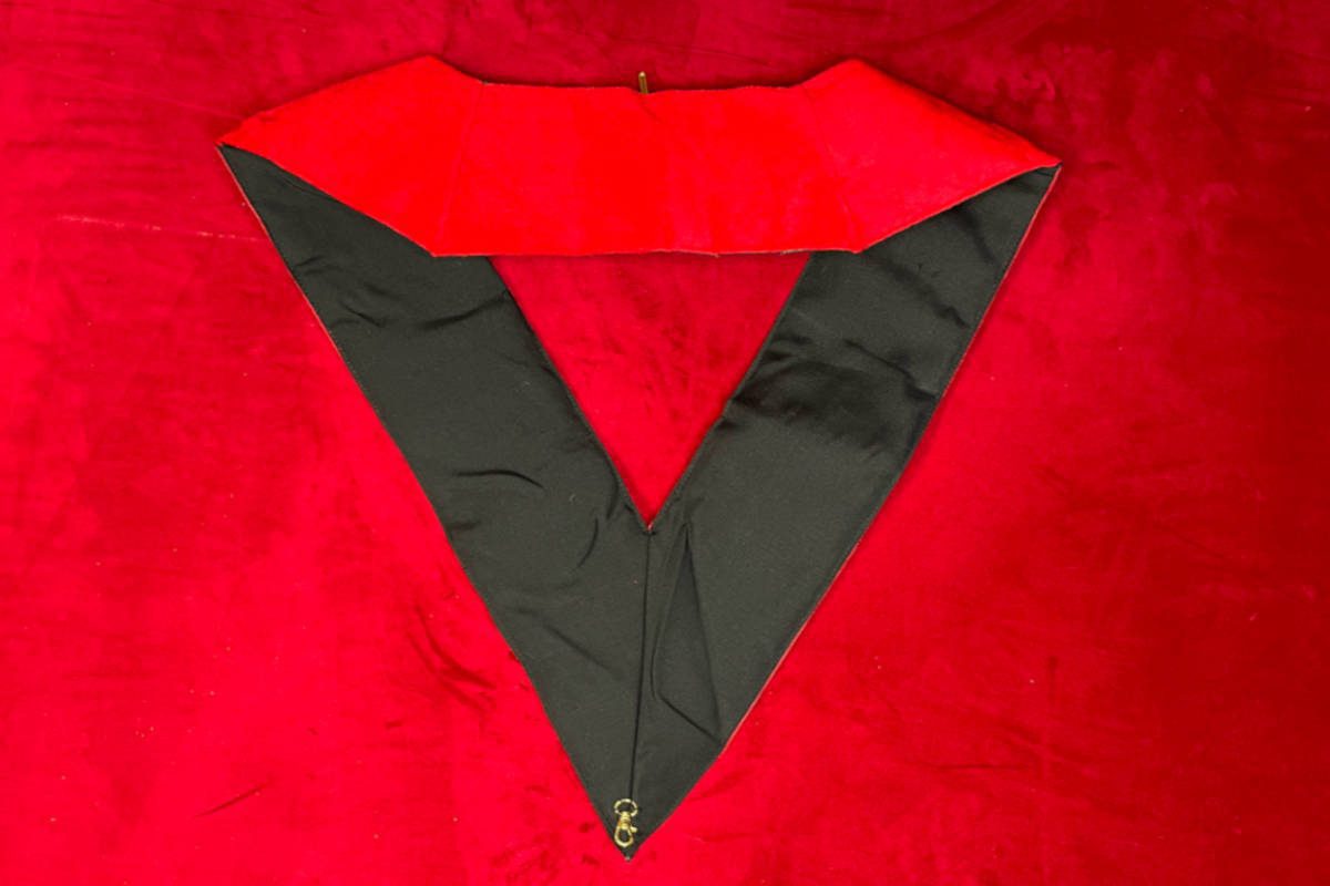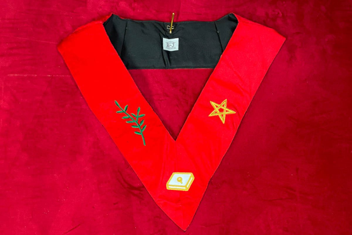 Sautoir de Grand Elu Parfait Sublime Maçon, 14e degré du REAA (Rite Ecossais Ancien et Accepté), de couleur rouge vif bordé main, avec comme symboles maçonniques :