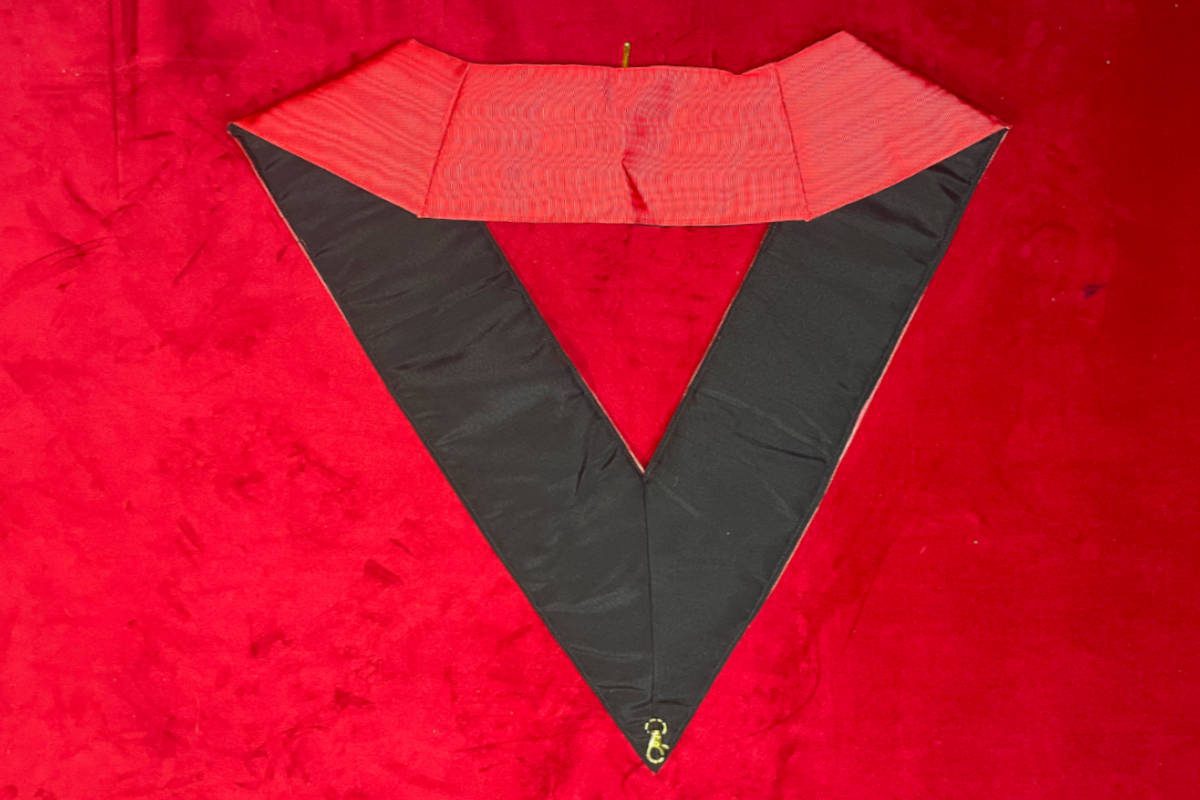Sautoir de Chevalier Rose Croix, 18e degré du REAA (Rite Ecossais Ancien et Accepté), avec comme symbole maçonnique une Croix pattée de gueules, avec rose intégrée et brodé main. Dos noir en deuil avec croix rouge et crochets dorés en haut et en bas porte-bijoux – Taille 53*2*11 cm (106 cm).