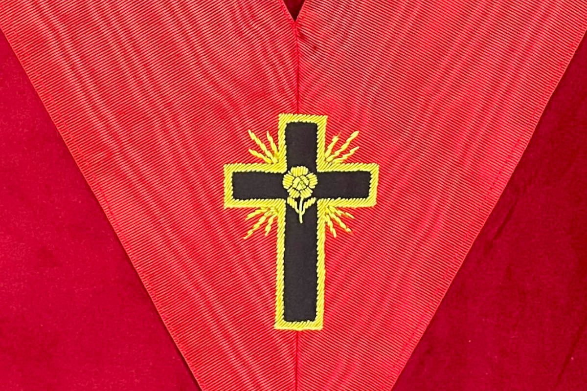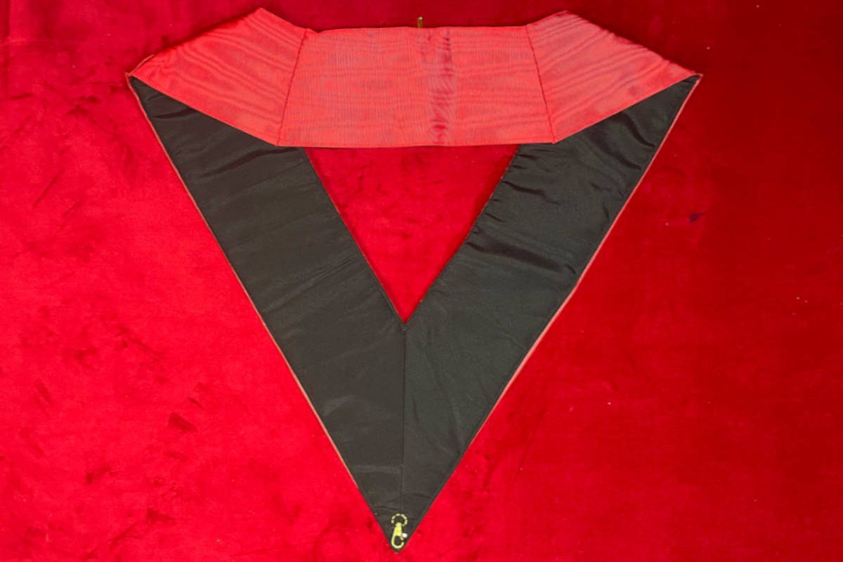 Sautoir de Chevalier Rose Croix, 18e degré du REAA (Rite Ecossais Ancien et Accepté), de couleur rouge, avec comme symbole maçonnique une croix latine étincelante avec rose brodée main. Dos noir en deuil avec deux crochets dorés un en haut et un en bas porte-bijoux – Taille 53*2*11 cm (106 cm).