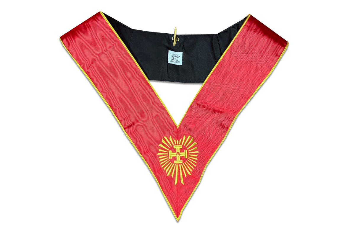 Sautoir de Chevalier Rose Croix, 18e degré du REAA (Rite Ecossais Ancien et Accepté), avec comme symbole maçonnique une Croix Templière dorée flamboyante et dos noir en deuil avec croix rouge, deux crochets dorés un en haut et un en bas porte-bijoux – Taille 53*2*11 cm (106 cm).