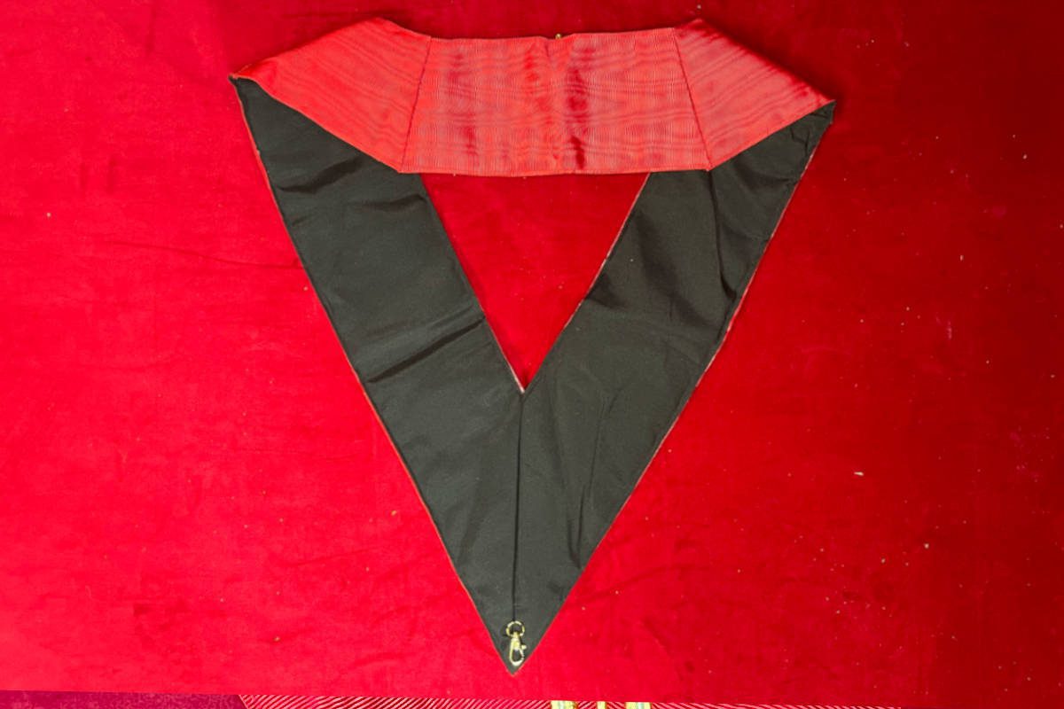 Sautoir de 2° Inspecteur, 31e degré du REAA (Rite Ecossais Ancien et Accepté), de couleur rouge, dos noir, avec comme symbole maçonnique le niveau – Taille 53*2*11 cm.