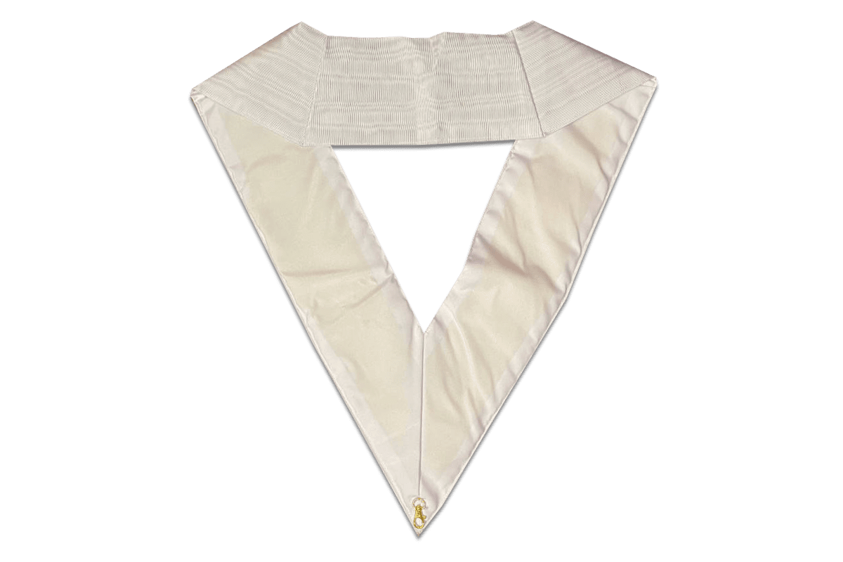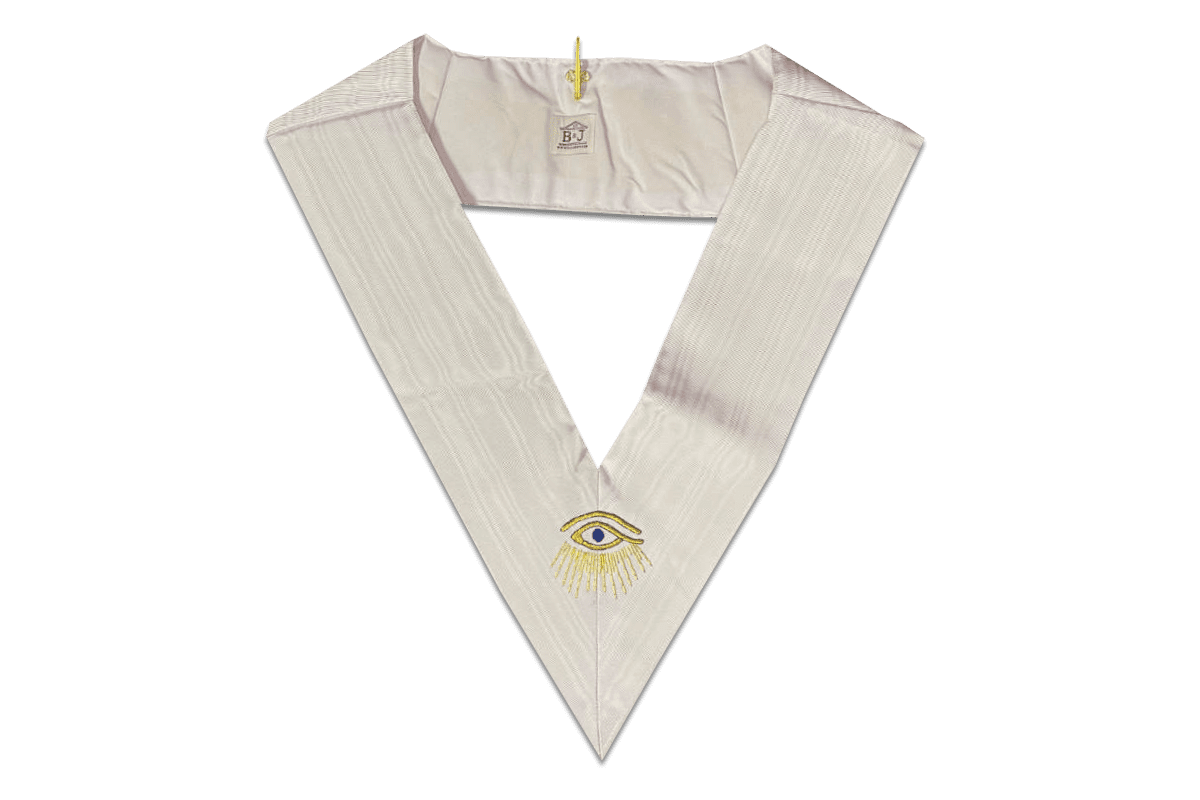 Sautoir de Chevalier Soleil, 28e degré du RMM (Rite de Memphis et Misraïm), de couleur blanche, avec comme symbole maçonnique un Œil Doré, brodé main et un crochet doré porte-bijoux – Taille 110*11 cm