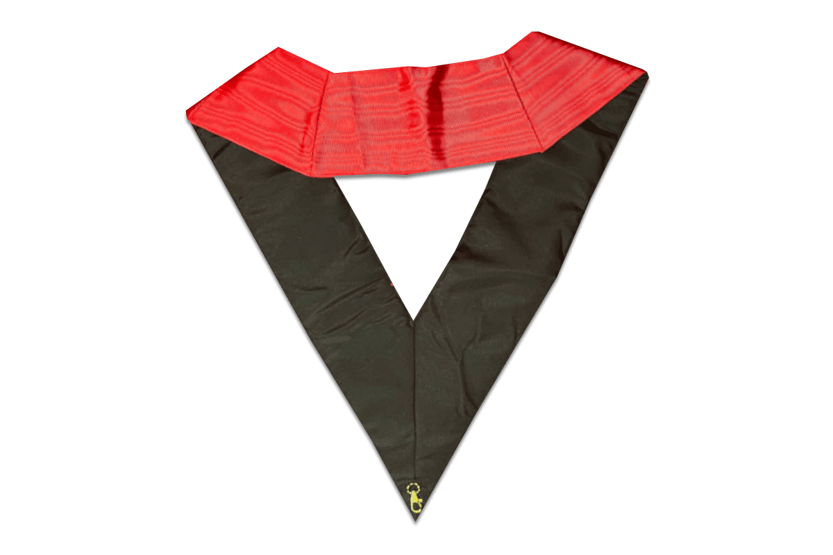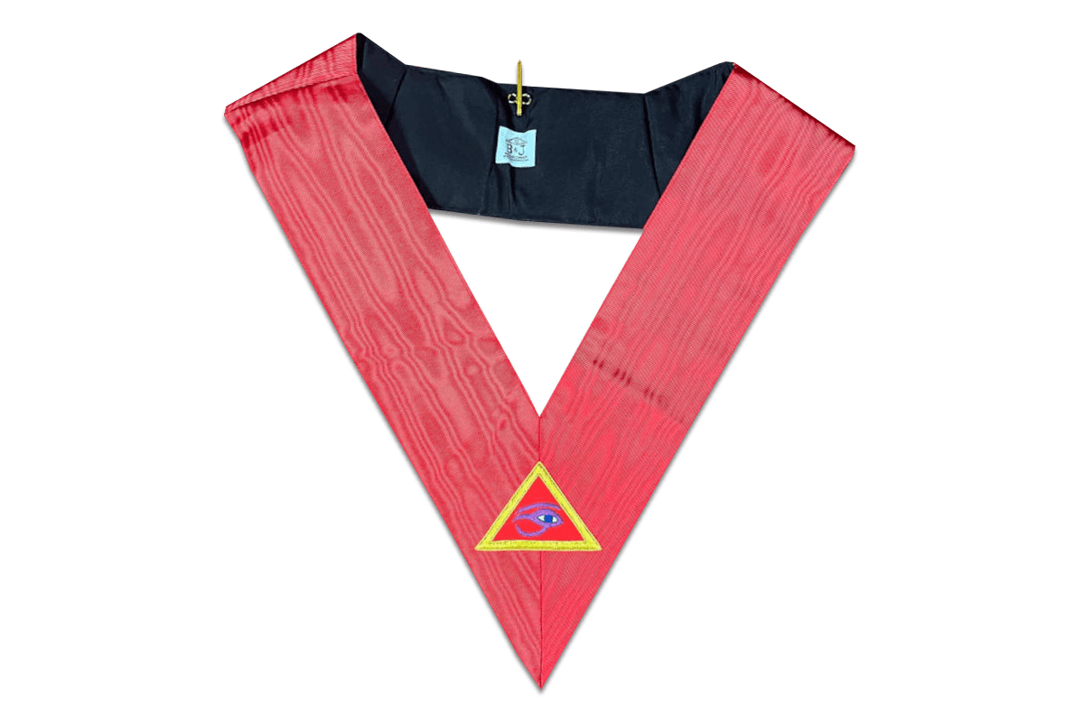 Sautoir, 90e degré du RMM (Rite de Memphis et Misraïm), de couleur rouge, avec comme symbole maçonnique un Delta, brodé main et un crochet doré porte-bijoux – Taille 110*11 cm.