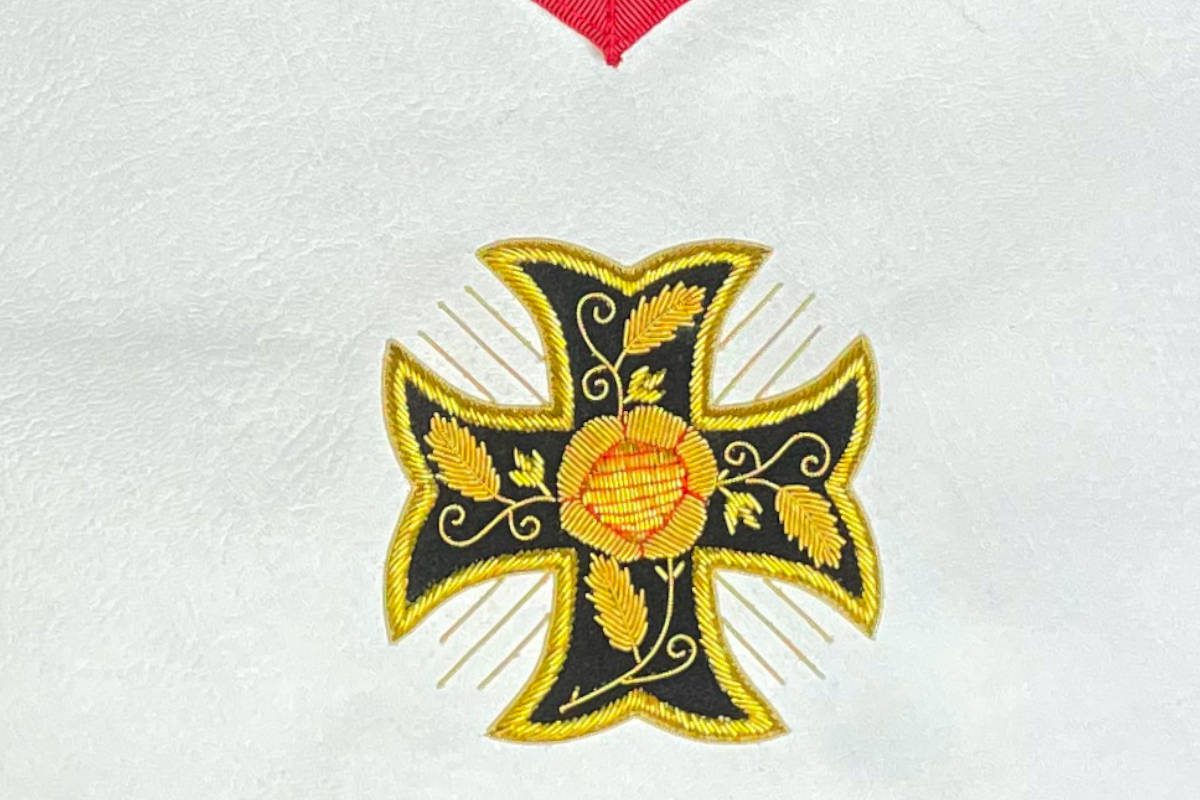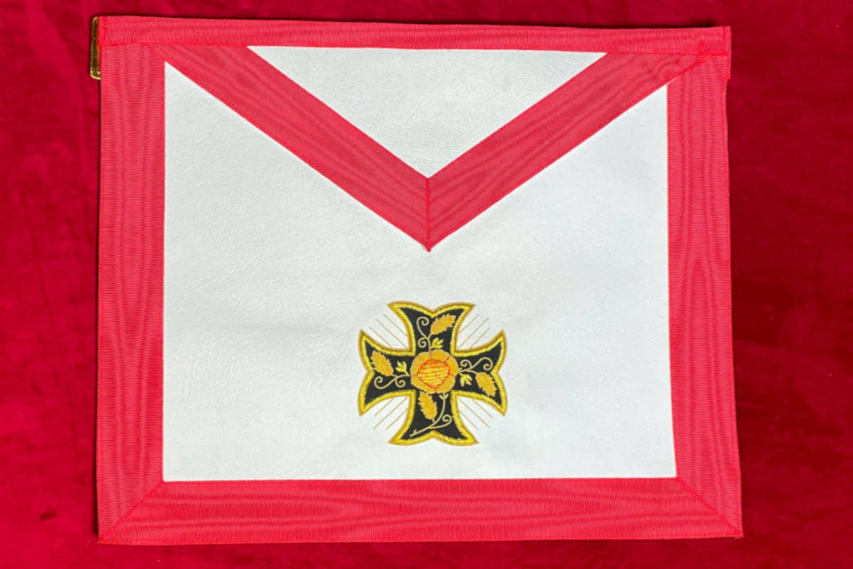 Tablier de Chevalier Rose Croix, 18e degré du REAA (Rite Ecossais Ancien et Accepté), avec comme symbole maçonnique une Croix patté de gueules étincelante, avec rose centrale entourée d’acacia, brodé main.