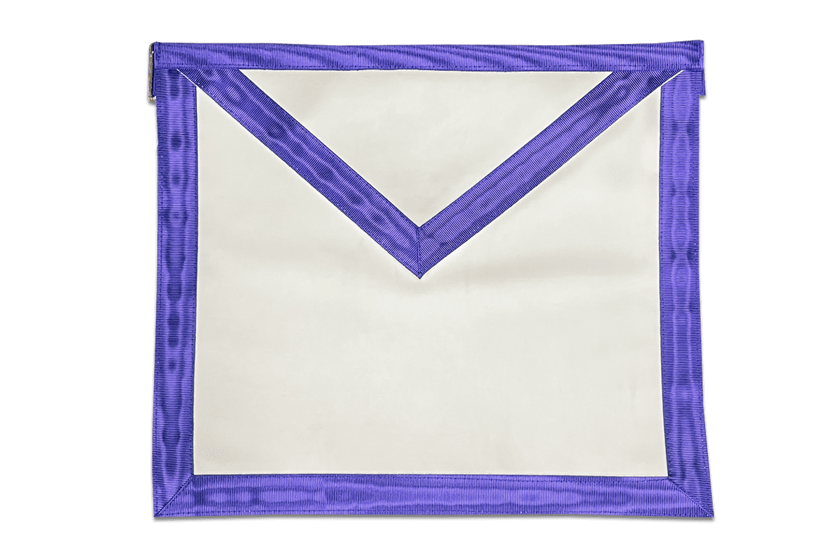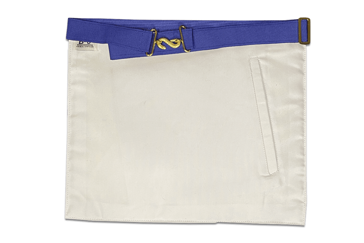 Tablier d’Apprenti – Compagnon du RMM (Rite de Memphis et Misraïm), de couleur blanche avec bordure bleue, avec fermoir en forme de serpent doré et poche dans le dos pour les gants.