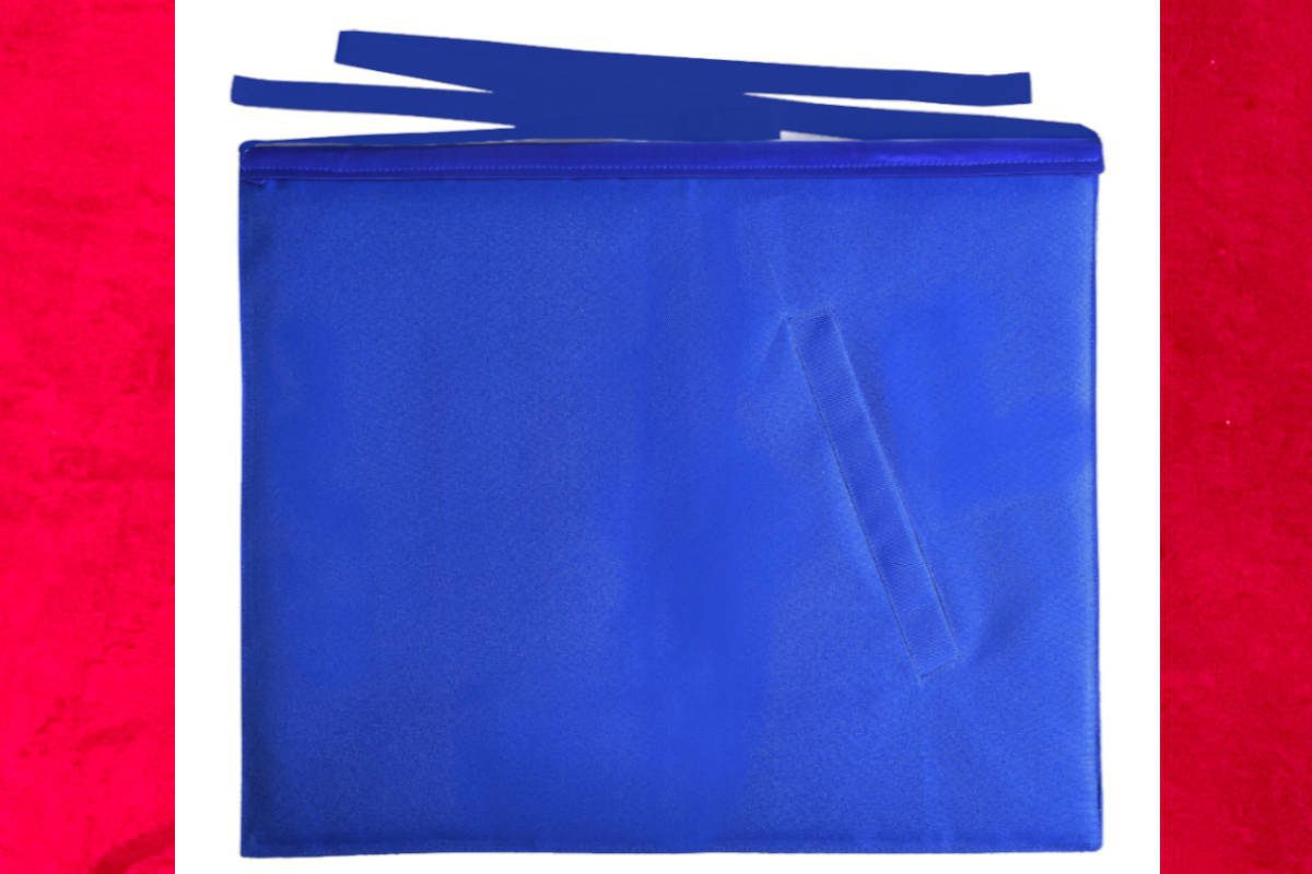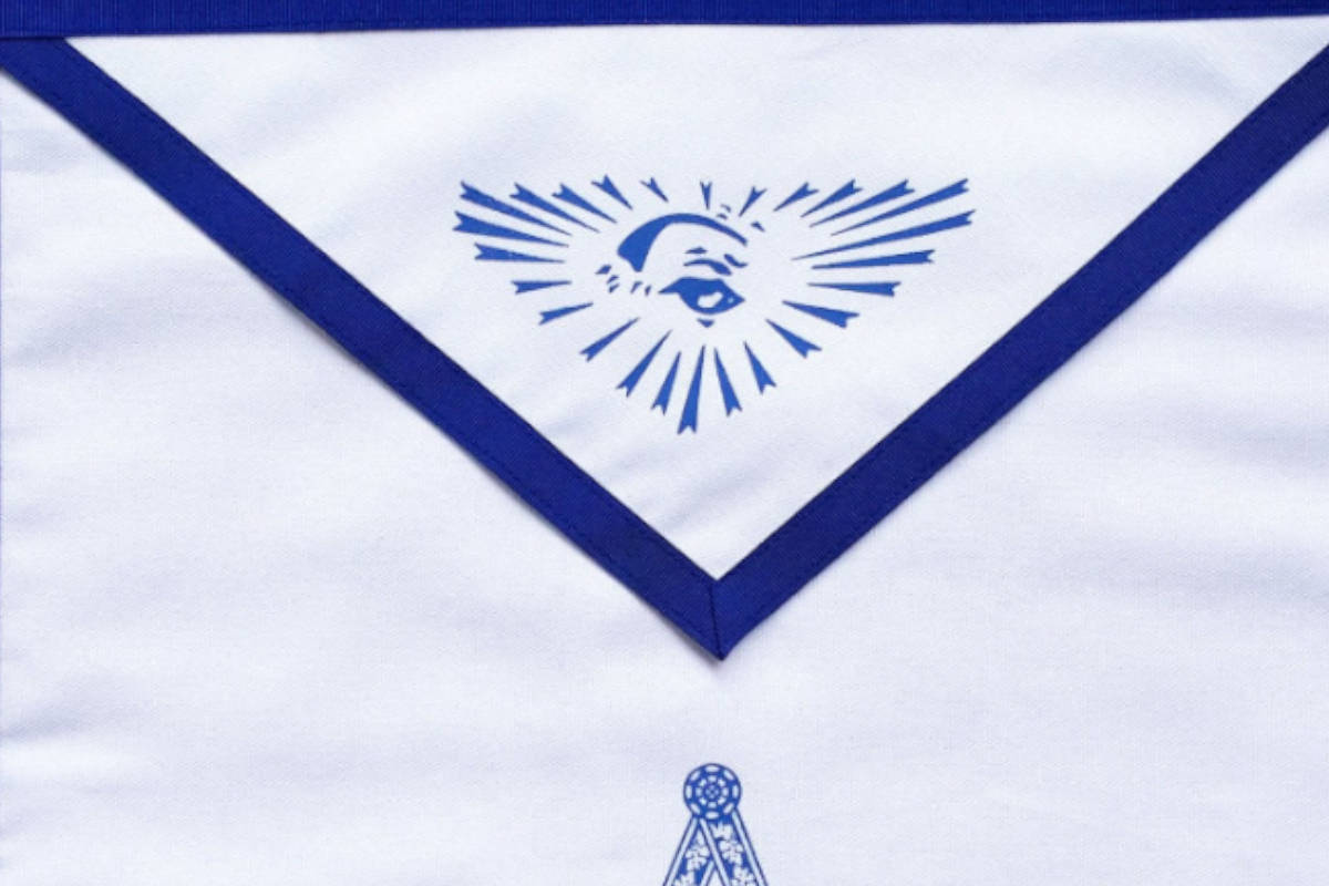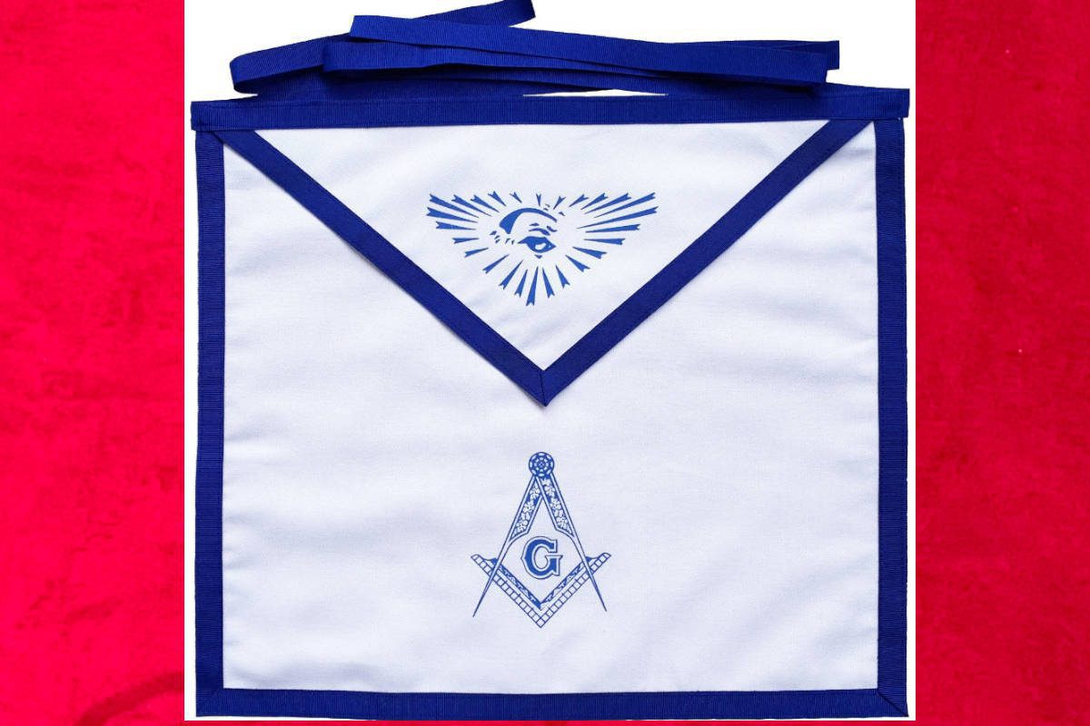 Tablier d’Apprenti – Compagnon du RY (Rite d’York), de couleur blanche, avec finitions bleu vif et symboles maçonniques :