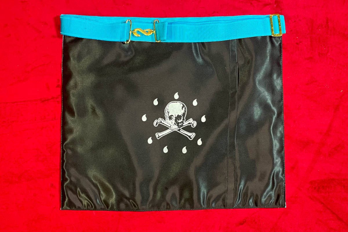 Tablier de Maître du RMM (Rite de Memphis et Misraïm), de couleur bleu clair, avec 3 Taus, 2 pendeloques, dos noir en deuil, avec un fermoir en forme de serpent doré et poche pour les gants – Taille 40*35 cm.