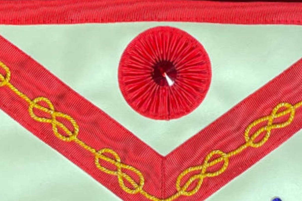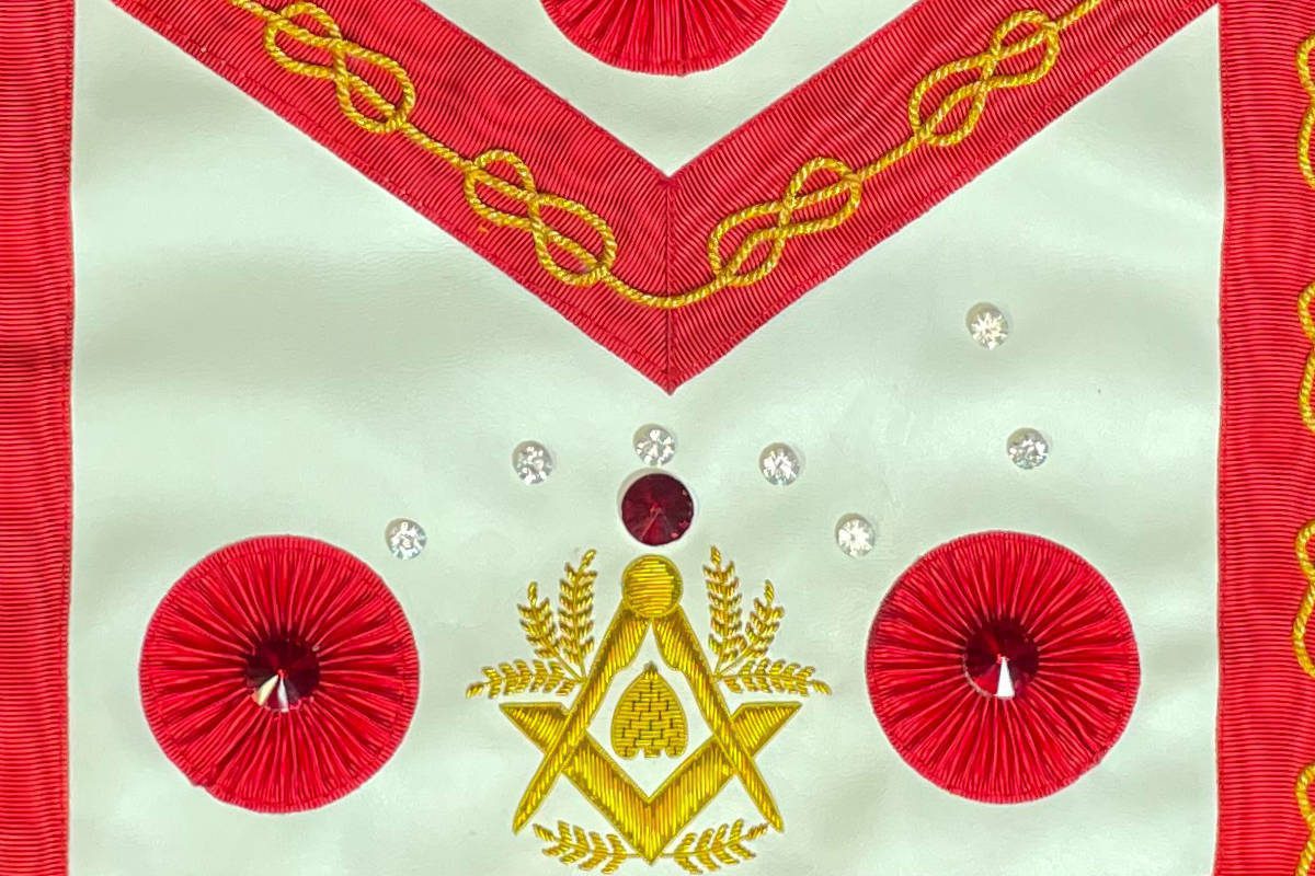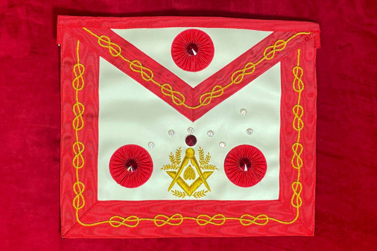 Tablier de Maître – REAA (Rite Ecossais ancien Accepté) – Série Voûte Céleste – Façon diamants étincelants – Trois Rosasses Rouges – Compas & Equerre – Nid d’abeille – Lacs d’Amour – Brodé main – Véritable Cuir – Dos deuil – Fermoir serpent doré – Taille 35*30 cm.