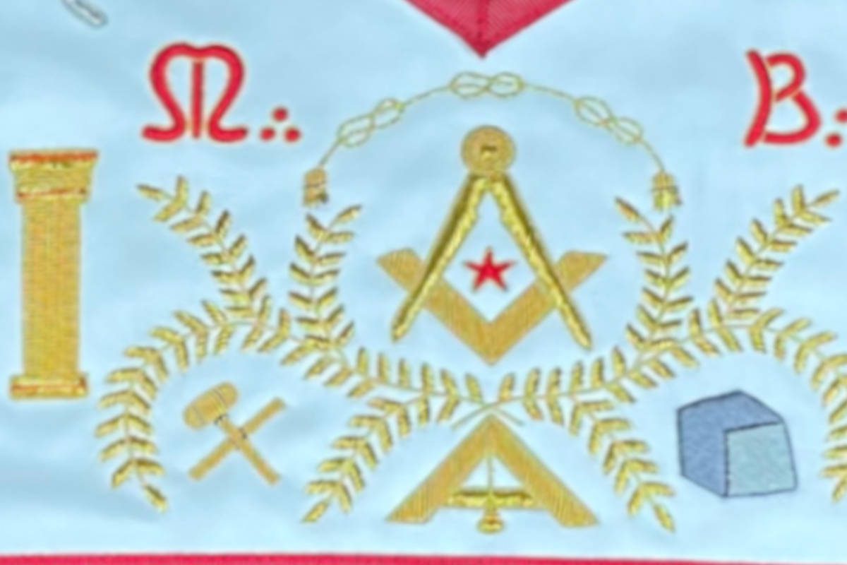 Tablier Maçonnique de Maître REAA – 2 Colonnes – Maillet et Ciseaux – Pierre Cubique – Perpendiculaire – Lune Soleil – Equerre et Compas, Branches d’Acacia – Etoile – Cercle – G