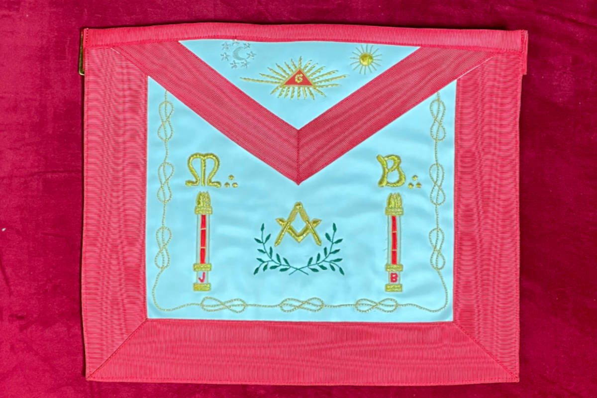 Tablier Maçonnique de Maître REAA – M:. B:. – Deux Colonnes B & J -Compas Equerre – Lacs – Acacias – Lune Soleil – Delta – G – Brodé main