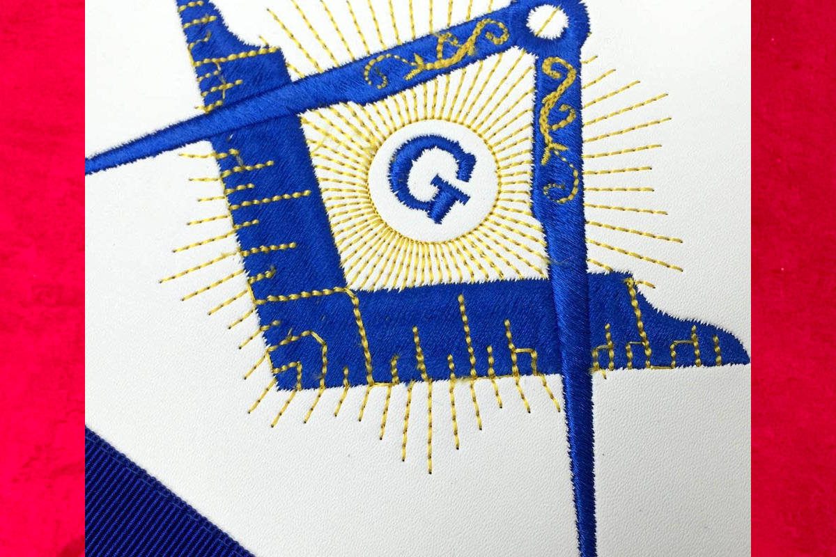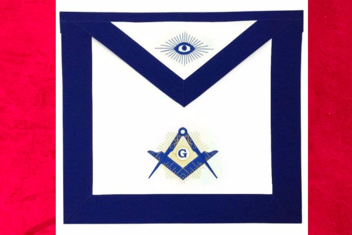 Tablier de Maître Maçon du RY (Rite d’York), de couleur Bleu foncé, avec comme symboles maçonniques :