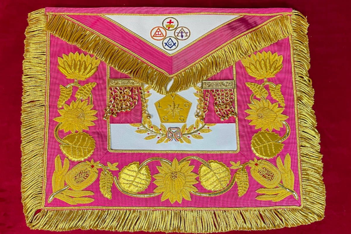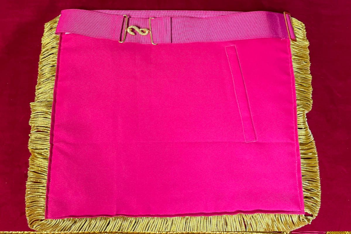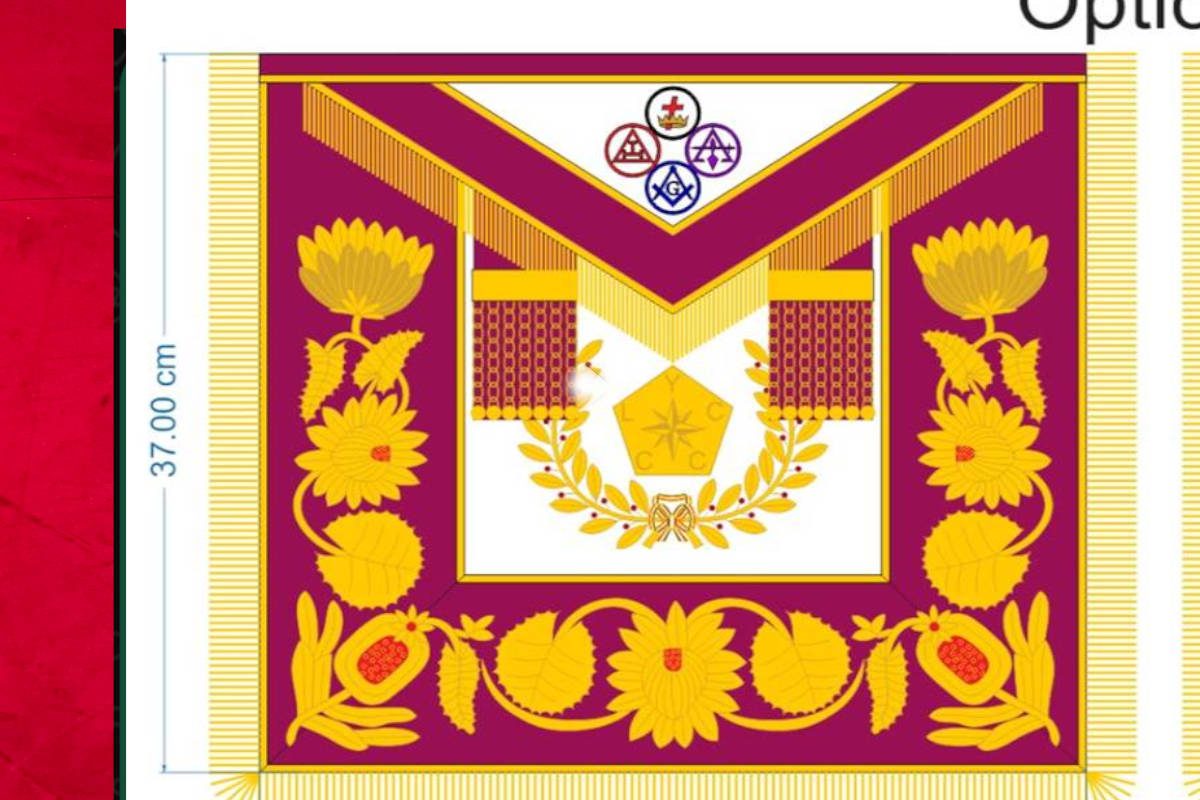 Tablier Maçonnique de Passé Grand Maître RdY personnalisé (Rite de York) – Juridiction – SCRYF – de Haute qualité de finition – avec Rose de Sable et Pentagone inscriptions Y L C C C – 2 Pendeloques – Brodé main – Finition en Franges dorées – taille 41*37 cm