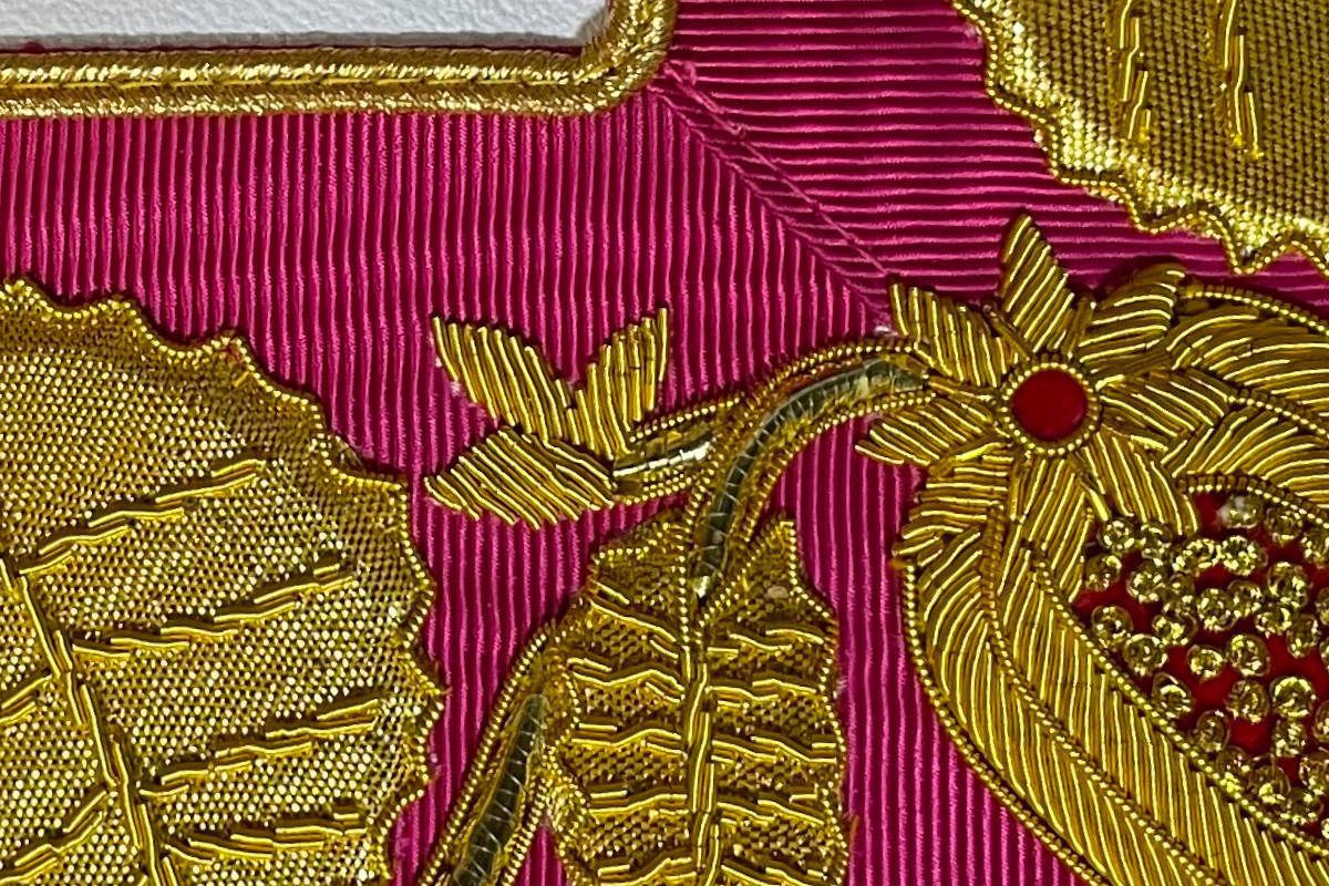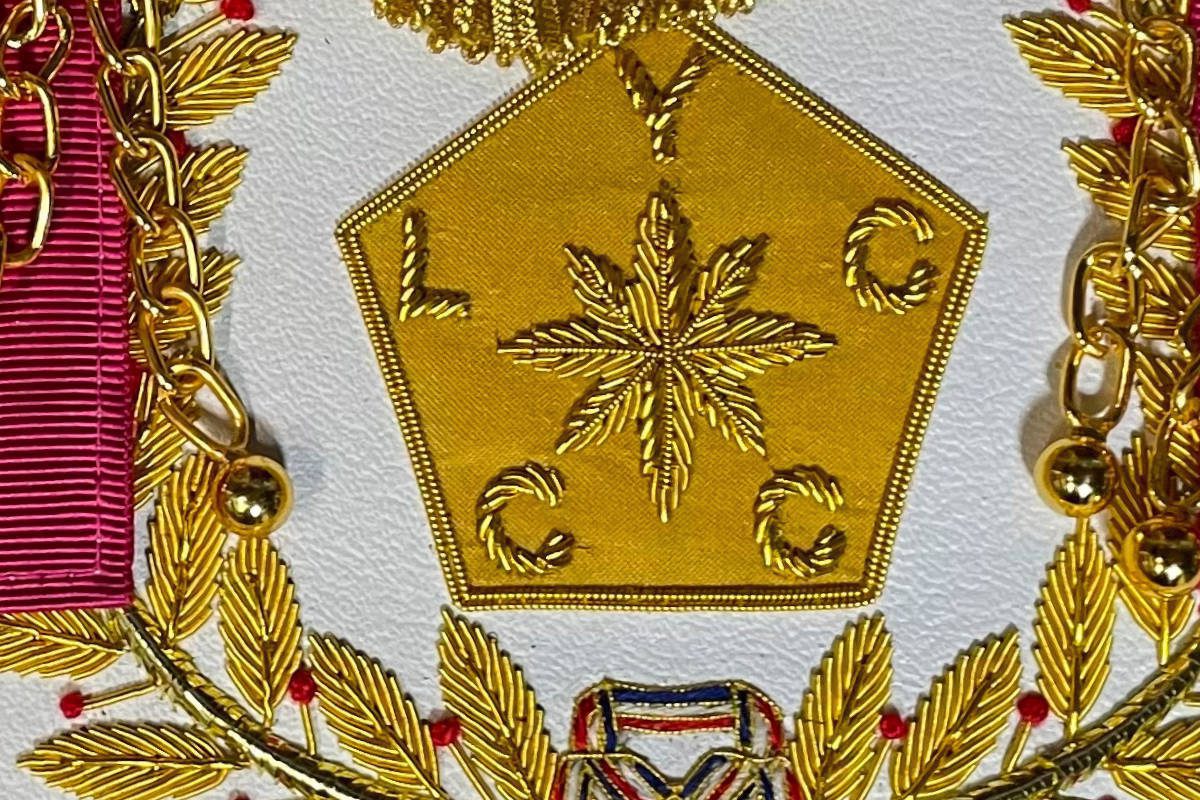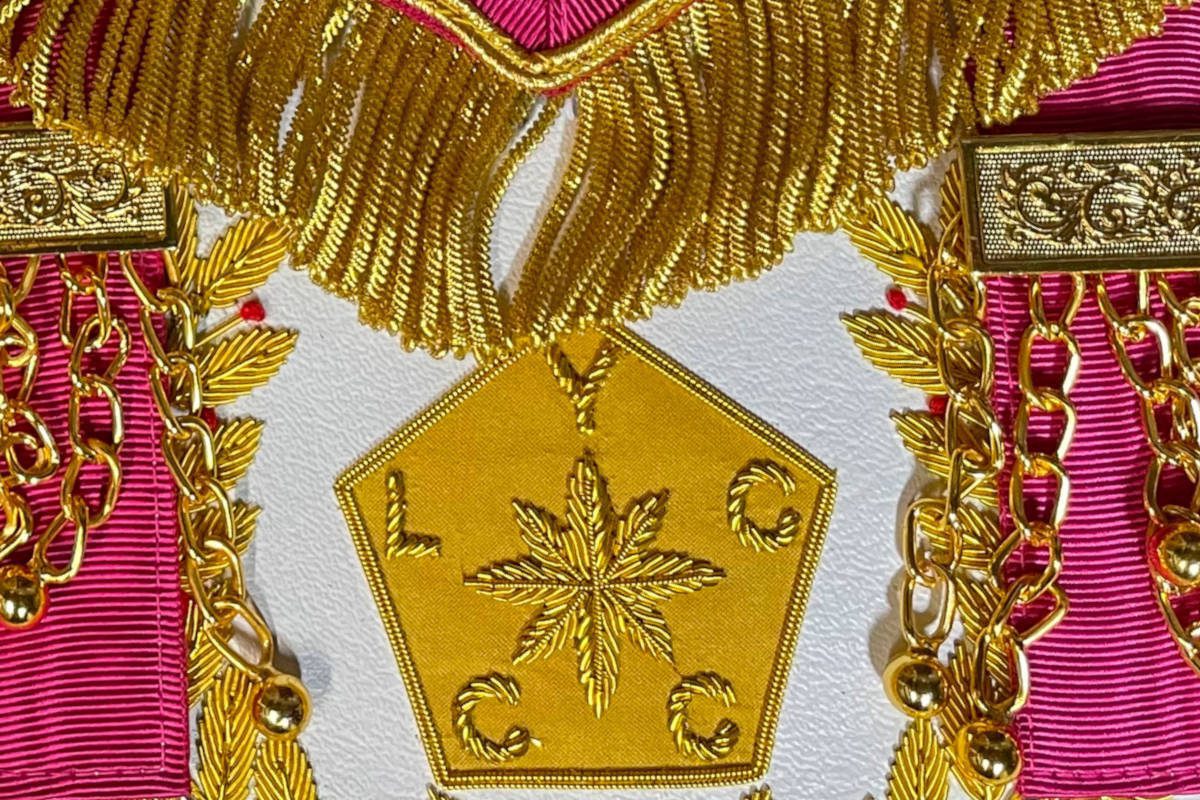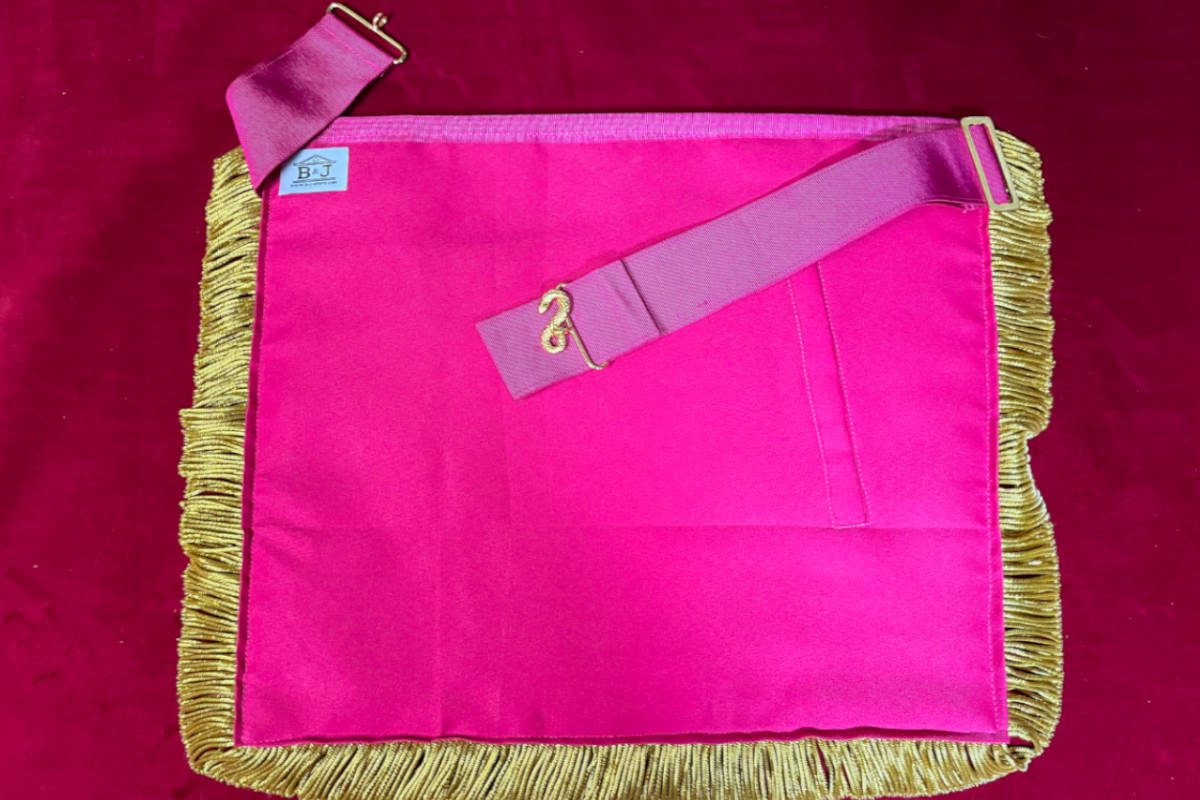 Tablier Maçonnique de Passé Grand Maître RdY personnalisé (Rite de York) – Juridiction – SCRYF – de Haute qualité de finition – avec Rose de Sable et Pentagone inscriptions Y L C C C – 2 Pendeloques – Brodé main – Finition en Franges dorées – taille 41*37 cm