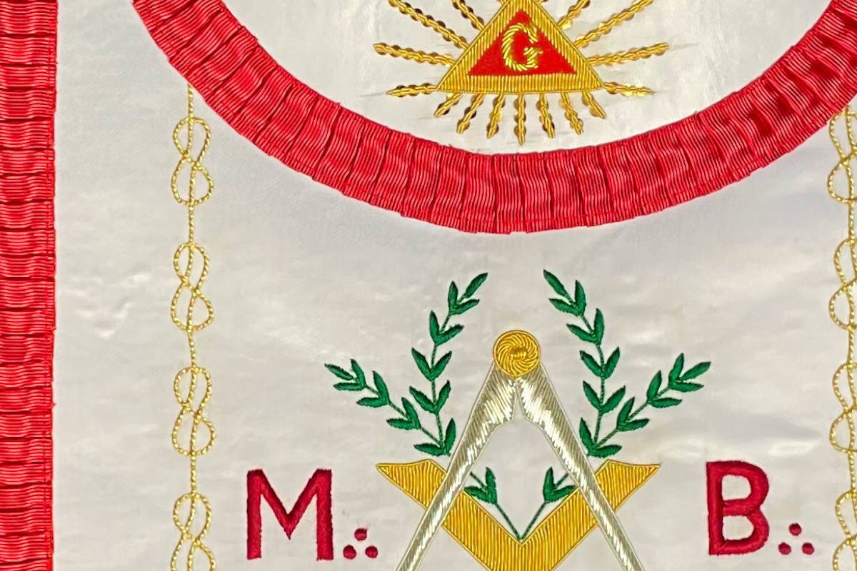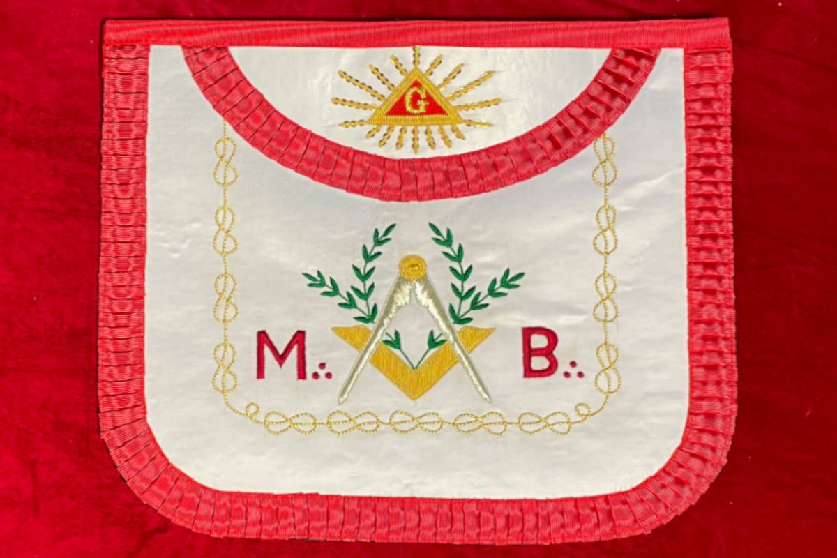 Tablier de Maître Maçon du REAA (Rite Ecossais Ancien et Accepté), façon ancienne (arrondie) avec comme symboles maçonniques :