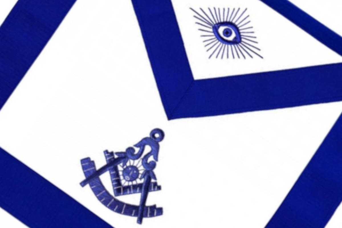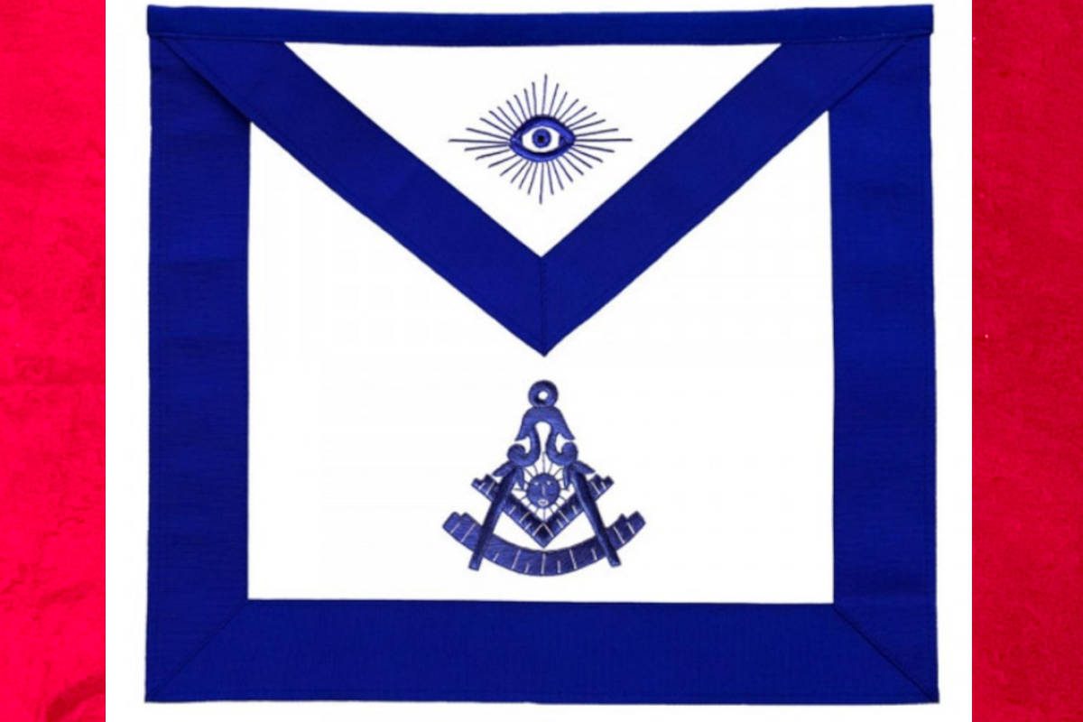 Tablier de Maître du RY (Rite d’York), de couleur bleu royal, avec comme symboles maçonniques :