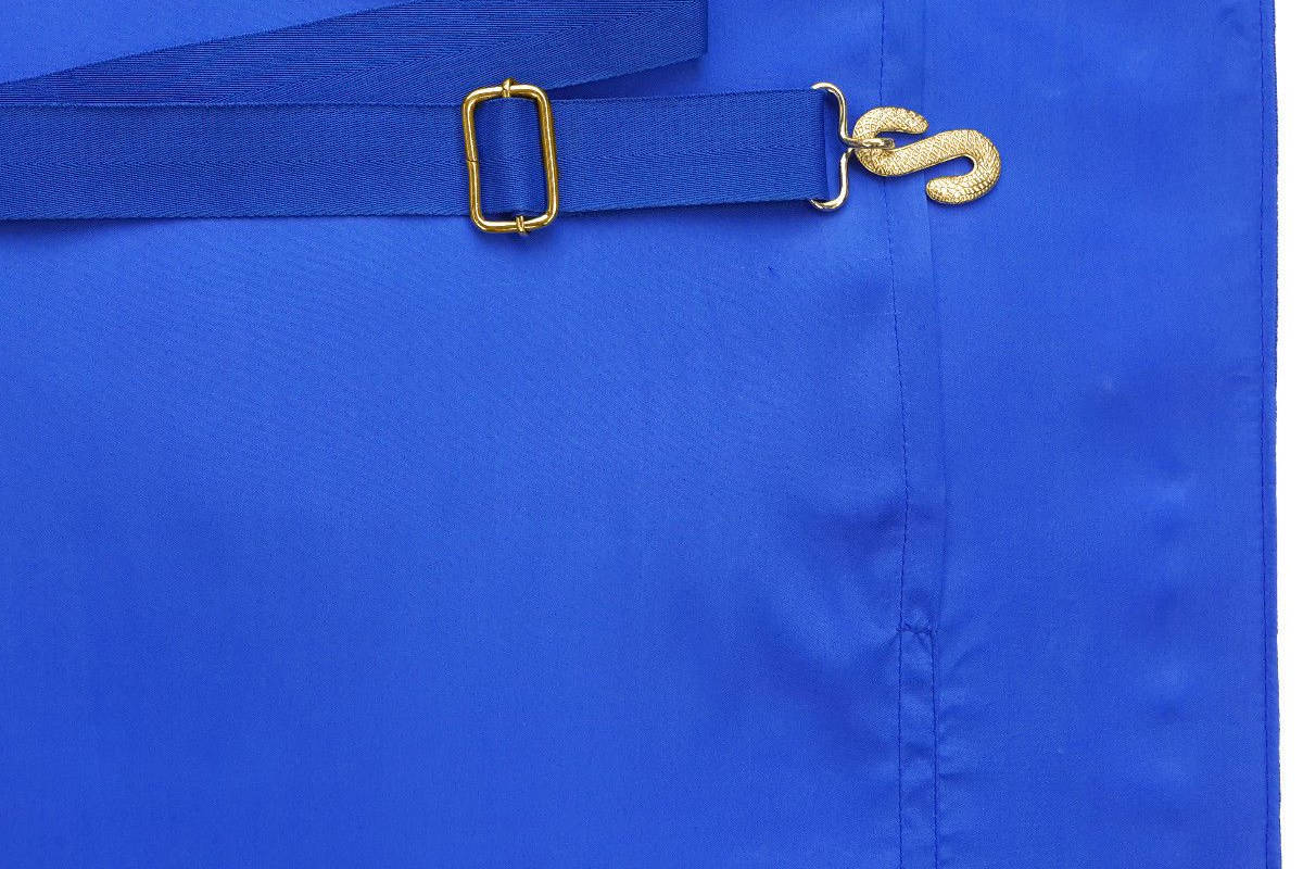Tablier Maçonnique de Maître RY (Rite d’York) – Bleu Royal – Equerre & Compas – Soleil – Œil Flamboyant – dos bleu avec poche pour gants