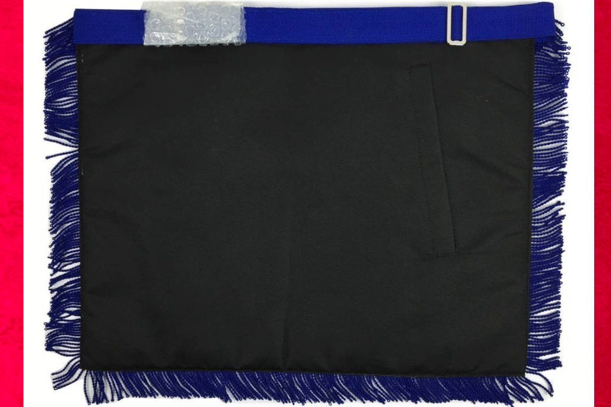 Tablier Maçonnique de Maître du RY (Rite d’York) de couleur Bleu Foncé avec franges, deux pendeloques, et comme symboles maçonniques :