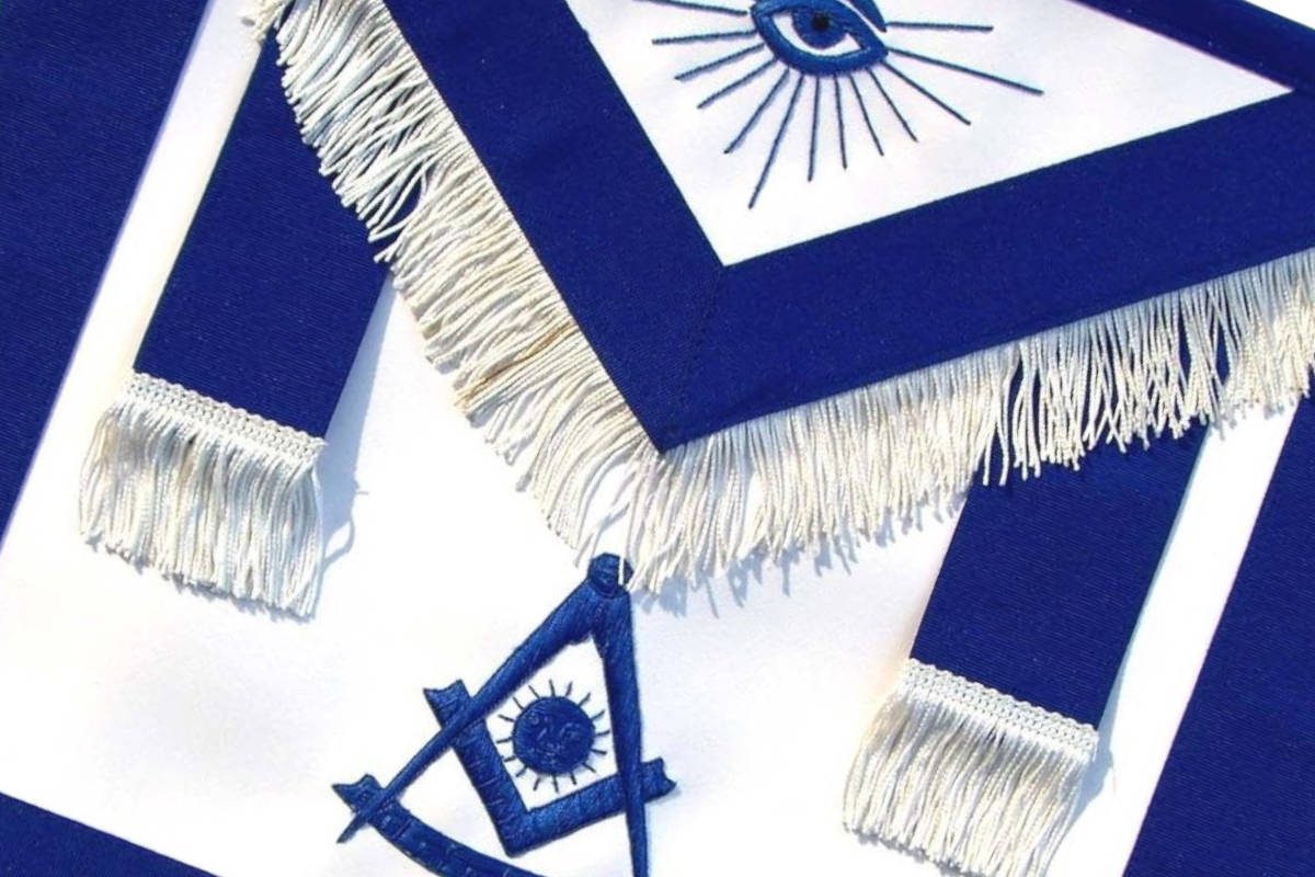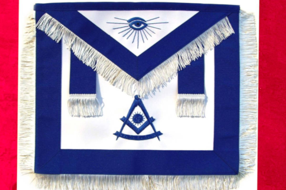 Tablier de Maître Maçon RY (Rite d’York) – Bleu foncé – Franges – Deux Pendeloques – Compas & Equerre – Soleil – Œil Flamboyant